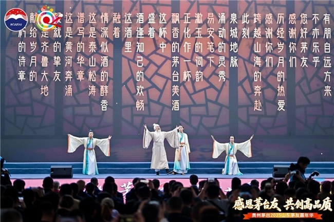 夜幕輕垂,茅友之夜如約啟幕?!懊┯鸭已纭迸c“微醺之夜”兩個(gè)篇章層層遞進(jìn),讓每一位茅友在舉杯共敬間,真情交流,切實(shí)感受到這份相聚里的感恩暖意與未來(lái)期許?!懊┯鸭已纭逼?,開(kāi)場(chǎng)舞劇《清照詞箋·永遇樂(lè )》深度結合明水古城清照文化,借虛實(shí)交織的舞臺設計,再現宋代文人雅集賞燈的盛景和“染柳煙濃”的詩(shī)意;山東茅臺傳承人攜手唱響AI定制歌曲《友朋自遠方來(lái)》,歡快的旋律、熱情的唱腔,既唱出茅臺的酒韻芬芳,更寄托著(zhù)“四海茅友是一家”的美好愿景;特色樂(lè )器演奏流淌心弦,一曲曲明月相伴的雅韻悠長(cháng),串聯(lián)起知己相逢的暖意,映照著(zhù)與茅臺共度的歲月靜好?!拔Ⅴ钢埂逼?,經(jīng)典歌曲唱響歲月情懷、搖滾派對點(diǎn)燃熱烈氛圍、微醺民謠傳遞溫柔情愫……茅友們在愉悅的視聽(tīng)享受中品鑒茅臺之美,感受身心放松的愜意。當旋律漸入尾聲,大家紛紛舉起熒光棒,在璀璨光影與歡樂(lè )氛圍中,為這場(chǎng)相聚暫畫(huà)上圓滿(mǎn)句點(diǎn)。